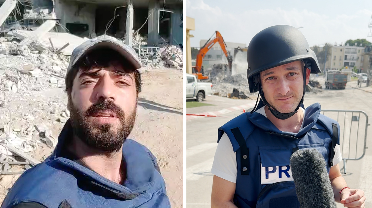 Left: NPR producer Anas Baba reports in Rafah, southern Gaza, after an Israeli strike hit the area on Oct. 17, 2023. Right: NPR’s Jerusalem correspondent Daniel Estrin reports in Sderot, Israel on Oct. 11, 2023.