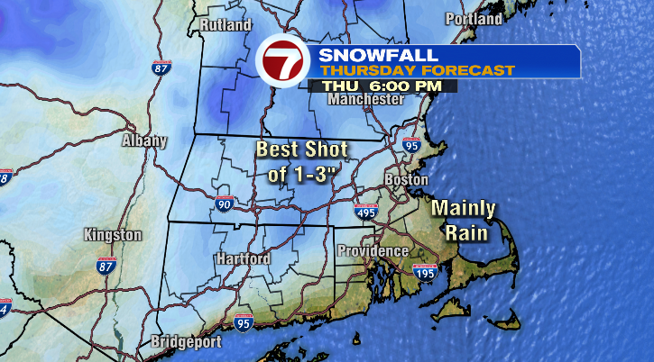 Temperatures will be coldest across the Worcester Hills, which is where the chance for the most snow will be. We could see some light accumulations of wet, heavy snow around 1-3 inches there. Elsewhere, it’ll either be mainly rain or just some scattered coatings. That’s because for many, highs will soar into the 40s on Thursday.