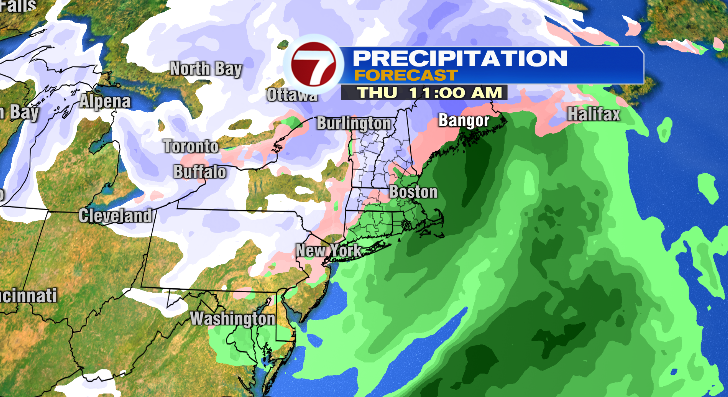 Low temperatures into Thursday morning will tumble into the upper 20s and low 30s. However, across southeastern Massachusetts, lows won’t be quite as cold in the mid to upper 30s. Rain and snow will continue for much of Thursday.