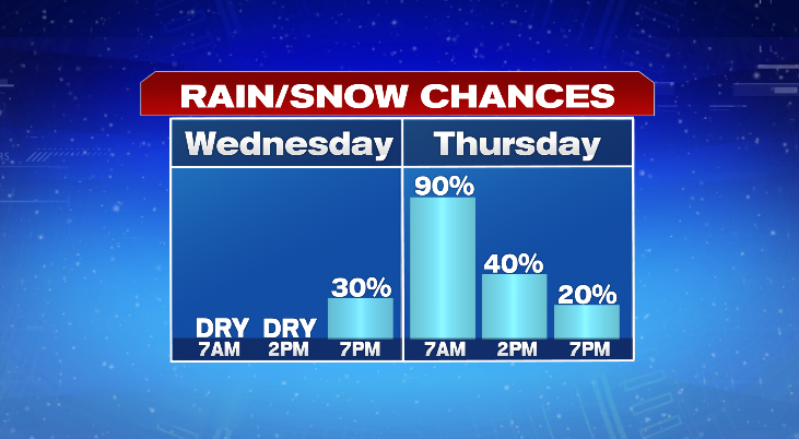 The rain and snow is coming with an Alberta Clipper — a low-pressure system that comes from Alberta, Canada that typically leads to light rain and snow accumulations and some gusty winds. The wind will be a component for us Thursday, mainly later in the day.