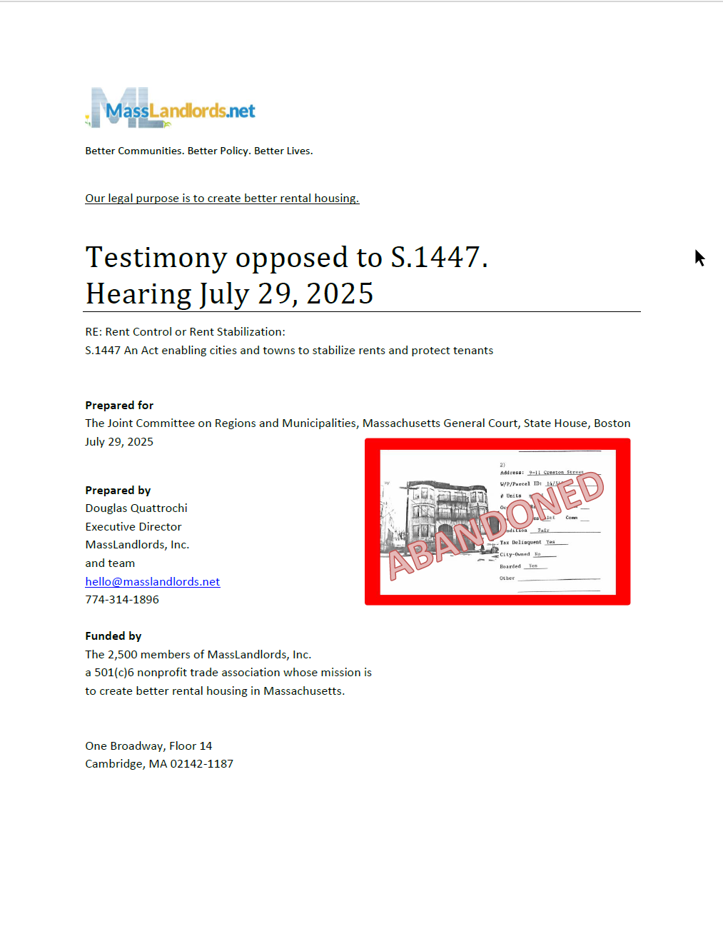 To submit written testimony, write a letter on company or personal letterhead and email hello@masslandlords.net subject: Rent control testimony, by 9 a.m. Tuesday, July 29. We will collate and submit testimony.